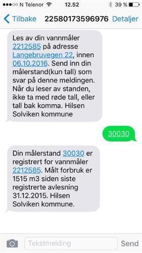 Hvis du mottar en SMS som du mener er sendt til feil nummer, ber vi deg om ikke å svare på denne. Abonnenter som ikke har svart på SMS vil motta avlesningskort i posten og riktig mobilnummer kan da meldes inn sammen med avlest stand.